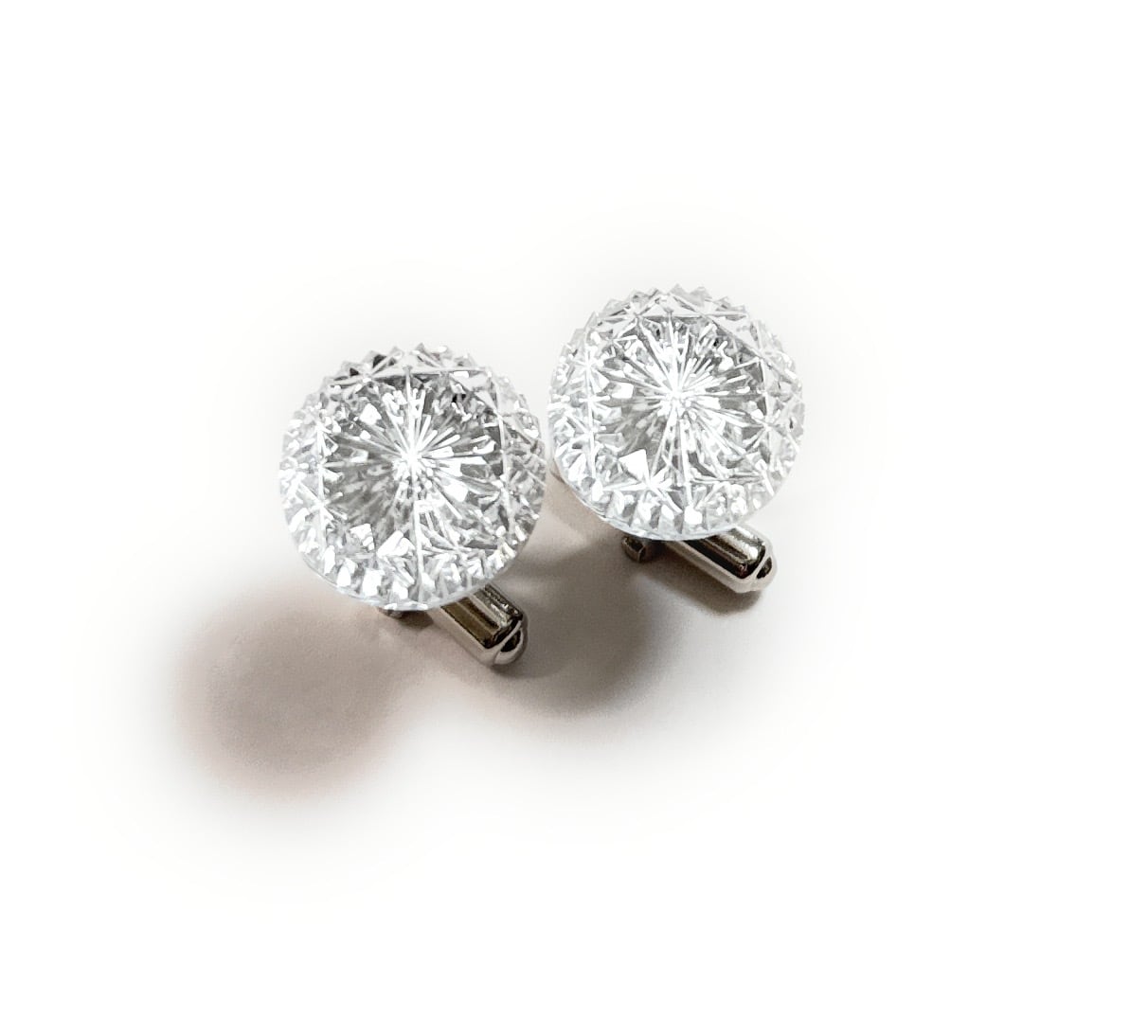 東京切子のカフスボタンのガラスには「光と反射」が入るように設計されております為、金物にガラスを平面接着できるのか、接着した際に反射が出るのか、光が十分に入るのか、特に比重2.5のガラスを接着した際に重くならない軽いもの、という条件が考慮されております。