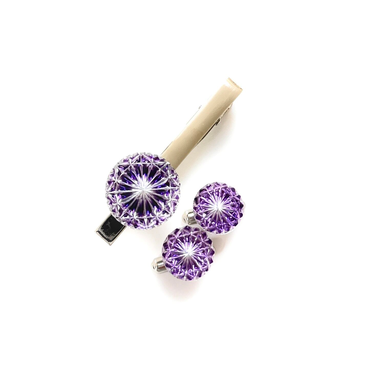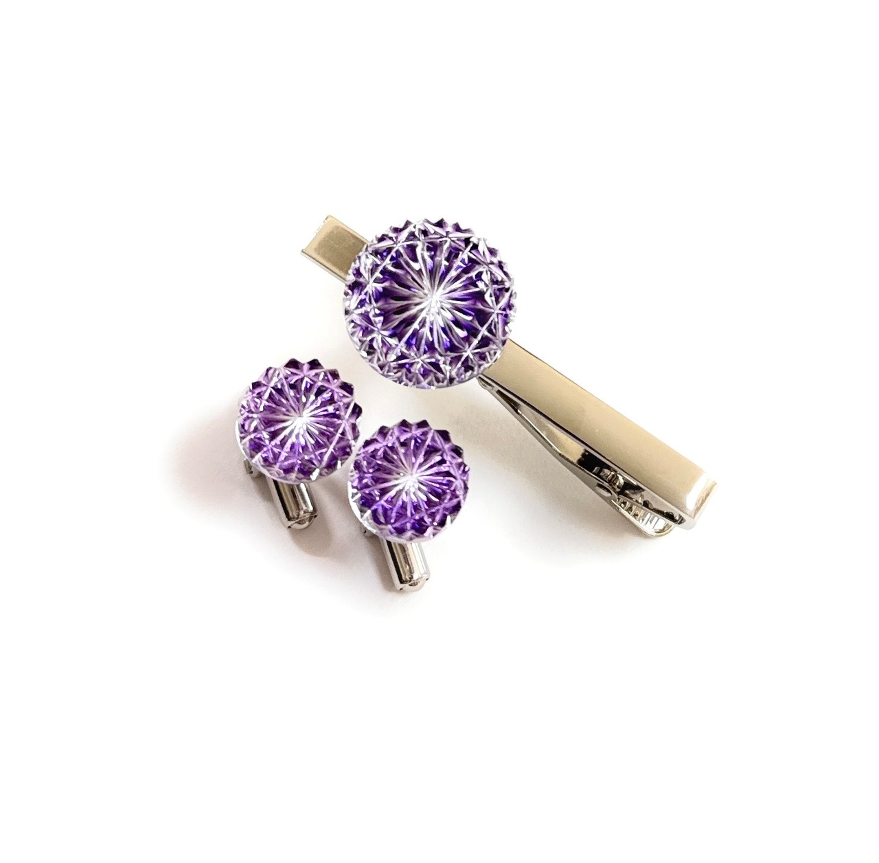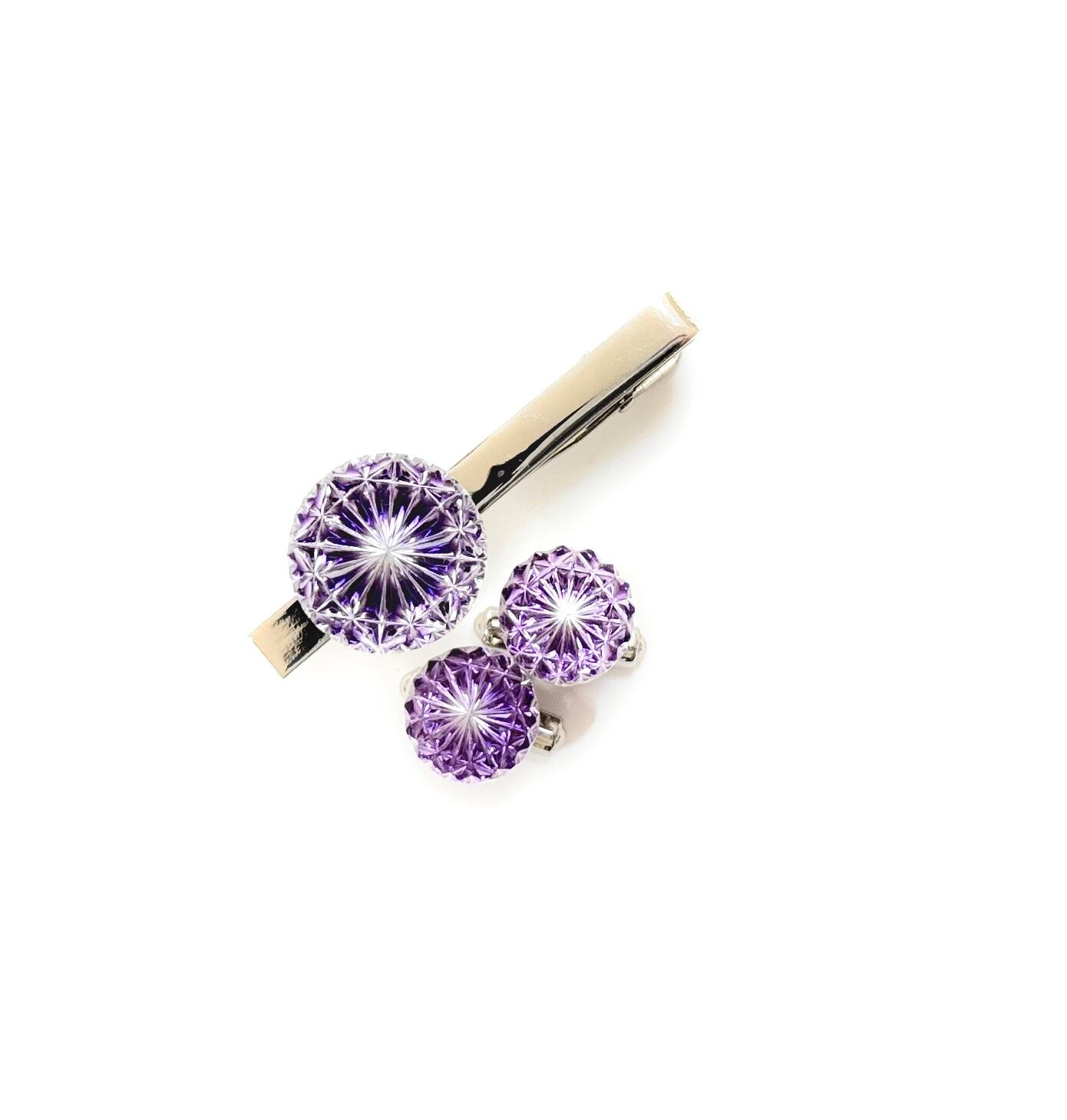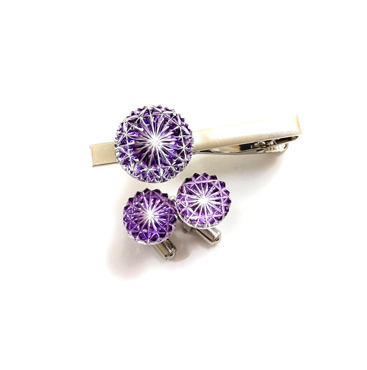 カフスとタイピンの詳細は「東京切子カフスボタン 菊 紫」「東京切子タイピン 菊 紫」のページをご参照ください。