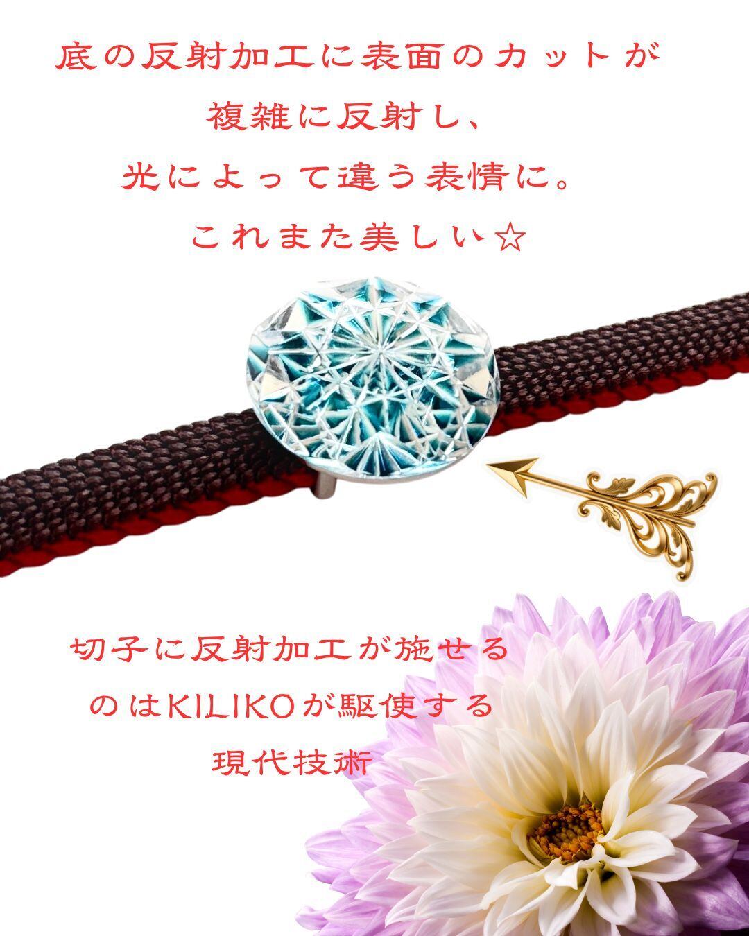 帯留めが光を呼ぶ切子で、しかもダリアのデザインであるということは、美しいダリアと切子の輝きが、身に着けられる方の心を静め、集中力を高め運を高めてくれそうです。