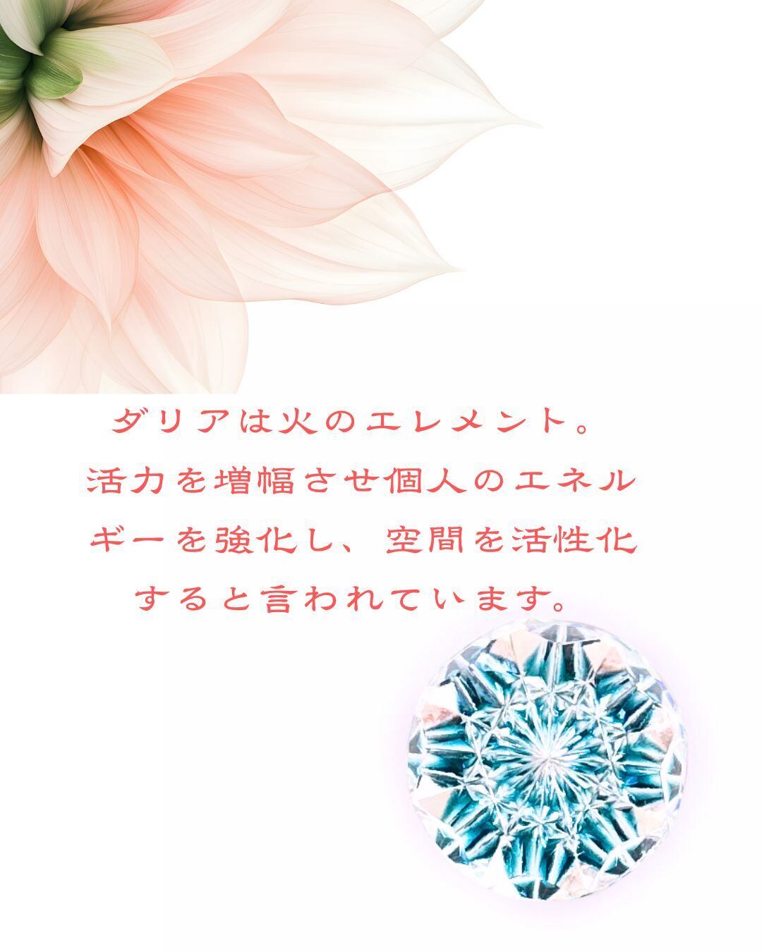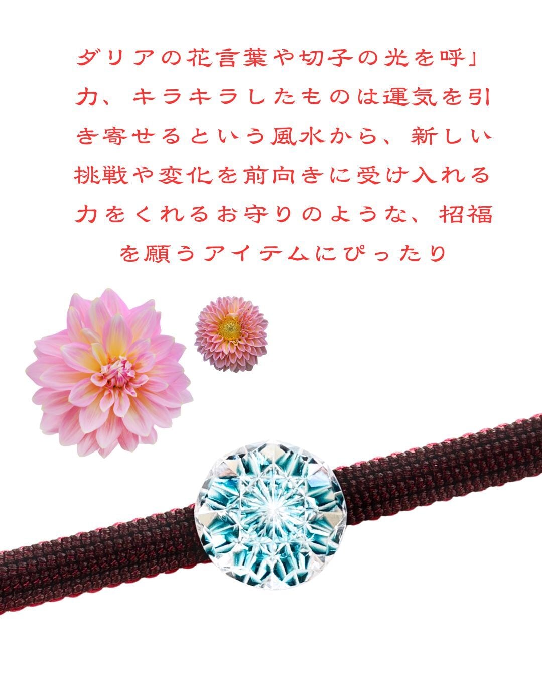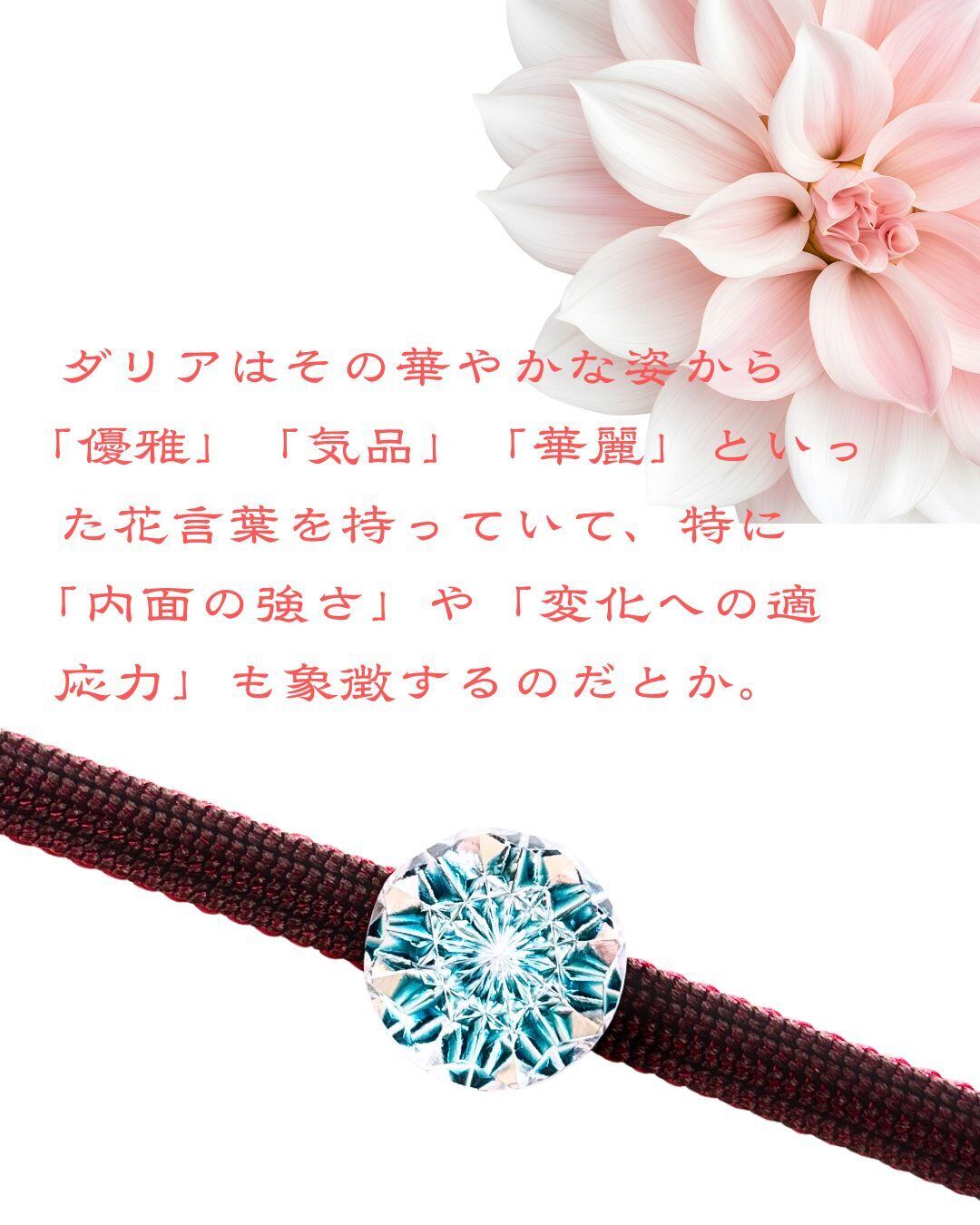 ダリアの花言葉や切子の「光を呼ぶ」力、キラキラしたものは「運気を引き寄せる」という風水から、新しい挑戦や変化を前向きに受け入れる力をくれるお守りのような、招福を願うアイテムとしてはぴったり!