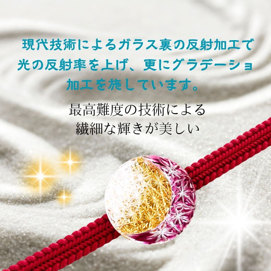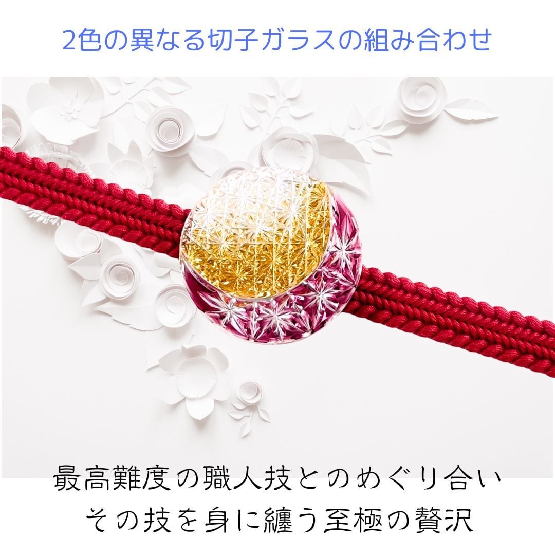 赤いガラスに掘られた麻乃葉の繰り返し模様は、無限の可能性や永遠の繁栄を象徴すると謂れているそうです。