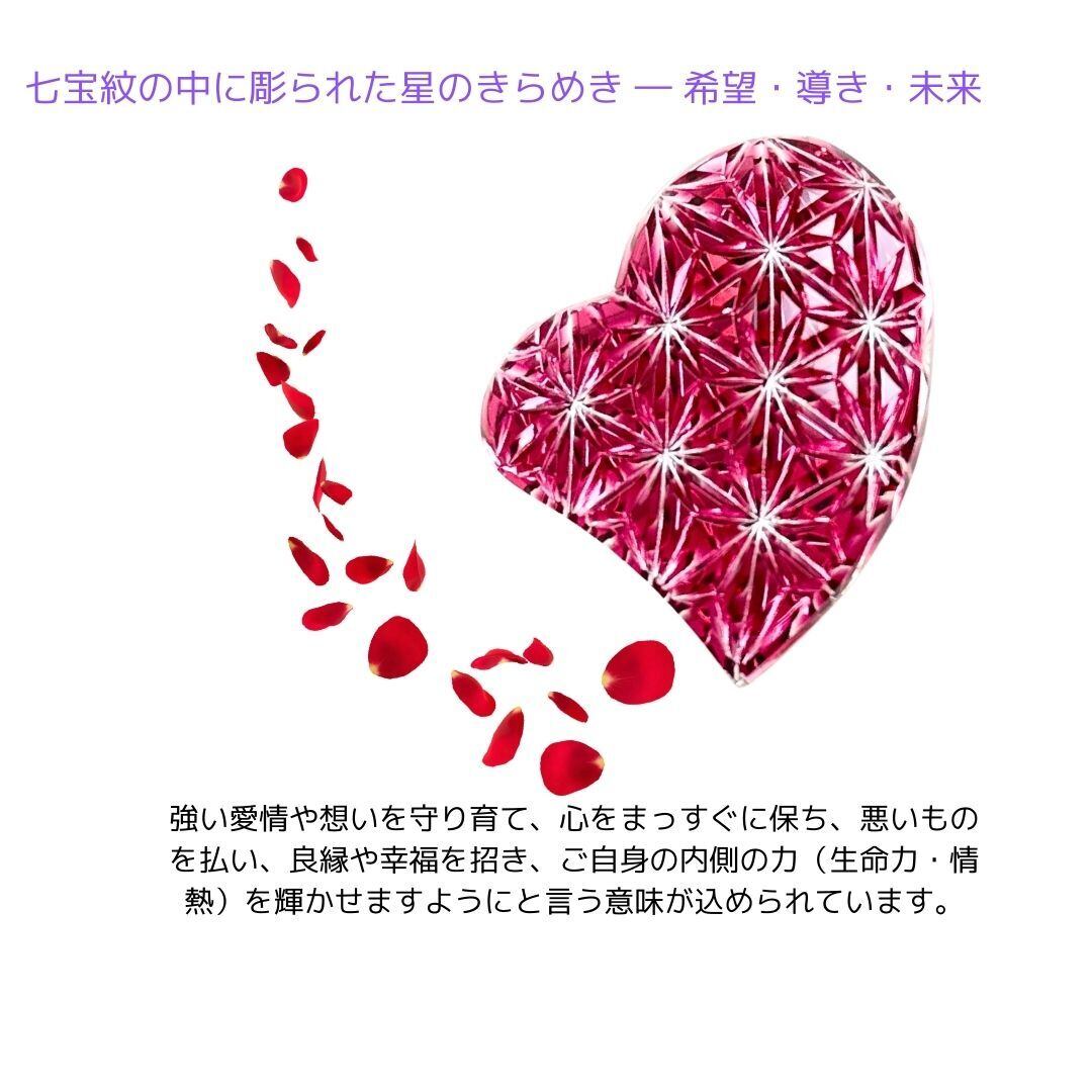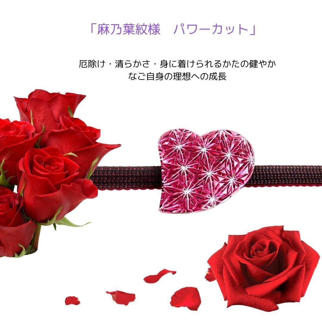 赤い金赤の輝き、ハートの形、麻乃葉の文様が重なることで、「愛と生命力を守り、育て、まっすぐに進むためのお守り」のような意味を帯びた帯留めになります。