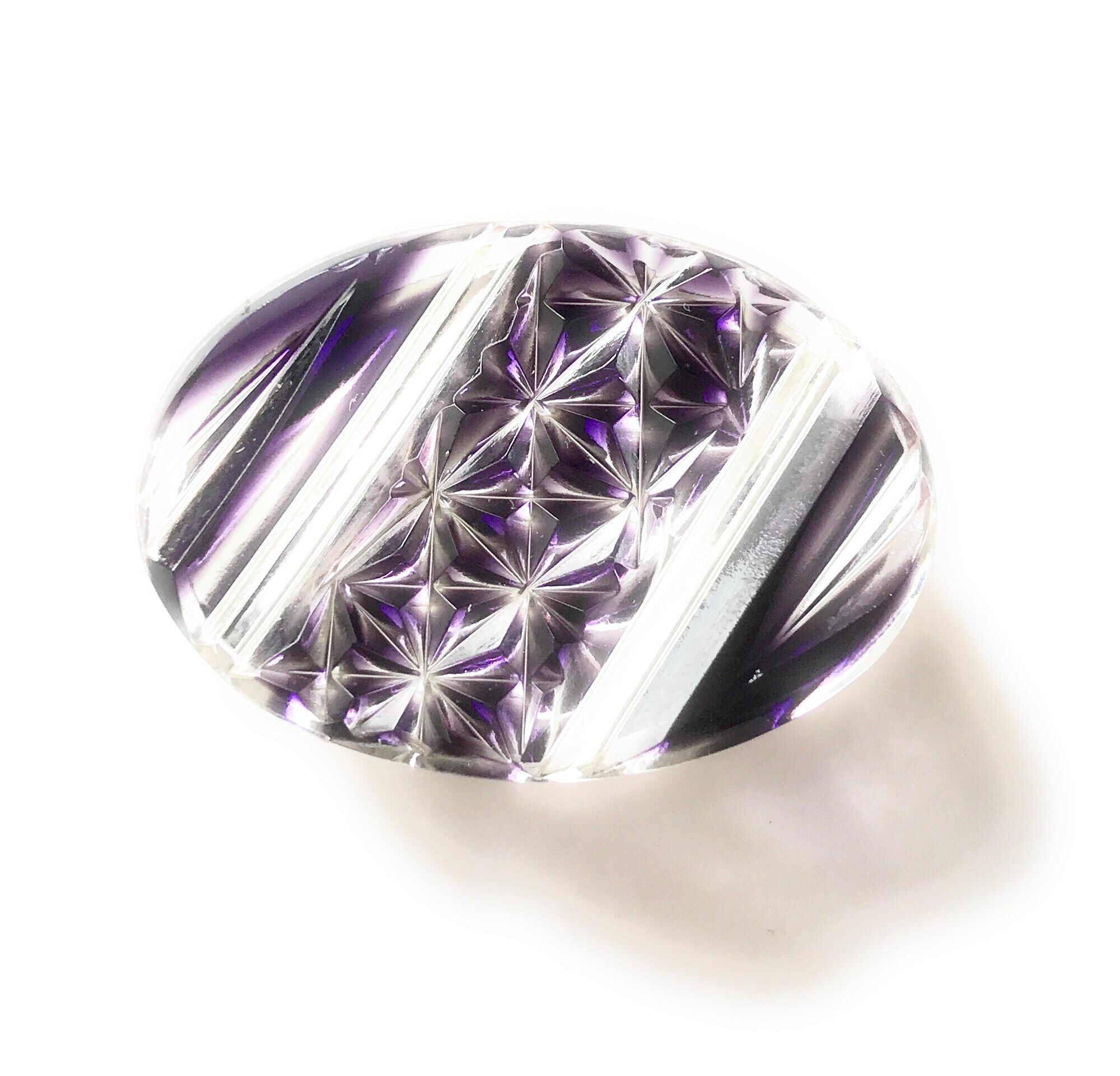 課題の通りに色を残し、反射面が多いパワーカットの麻乃葉を施すと、切子ガラスらしい色鮮やかな帯留めに仕上がりました。