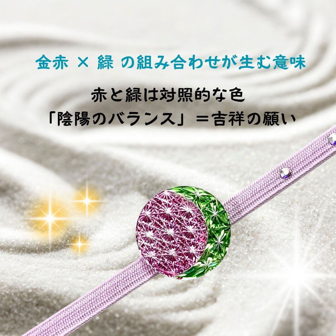 この帯留めには、「最高級の技術と材料(金赤)で、持つ人の人生が健やかに(緑)、そして最高に輝き続けますように」という、祈りが込められています。