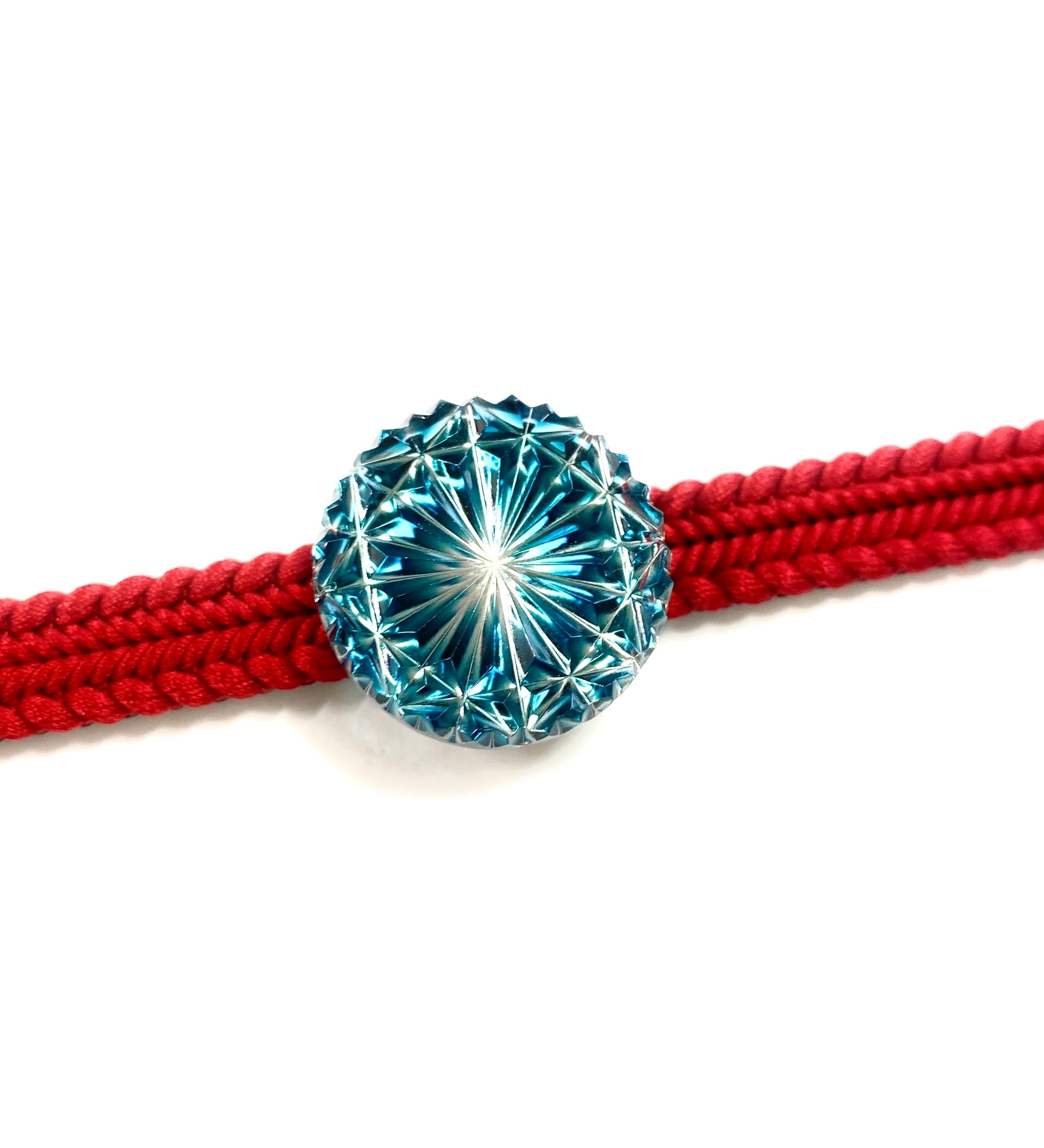 ガラスの素材は、吹きガラス職人さんが色被せガラスで生地を作り、その生地をひとつひとつ切り出して、シャープな菊の切子をあしらいました。