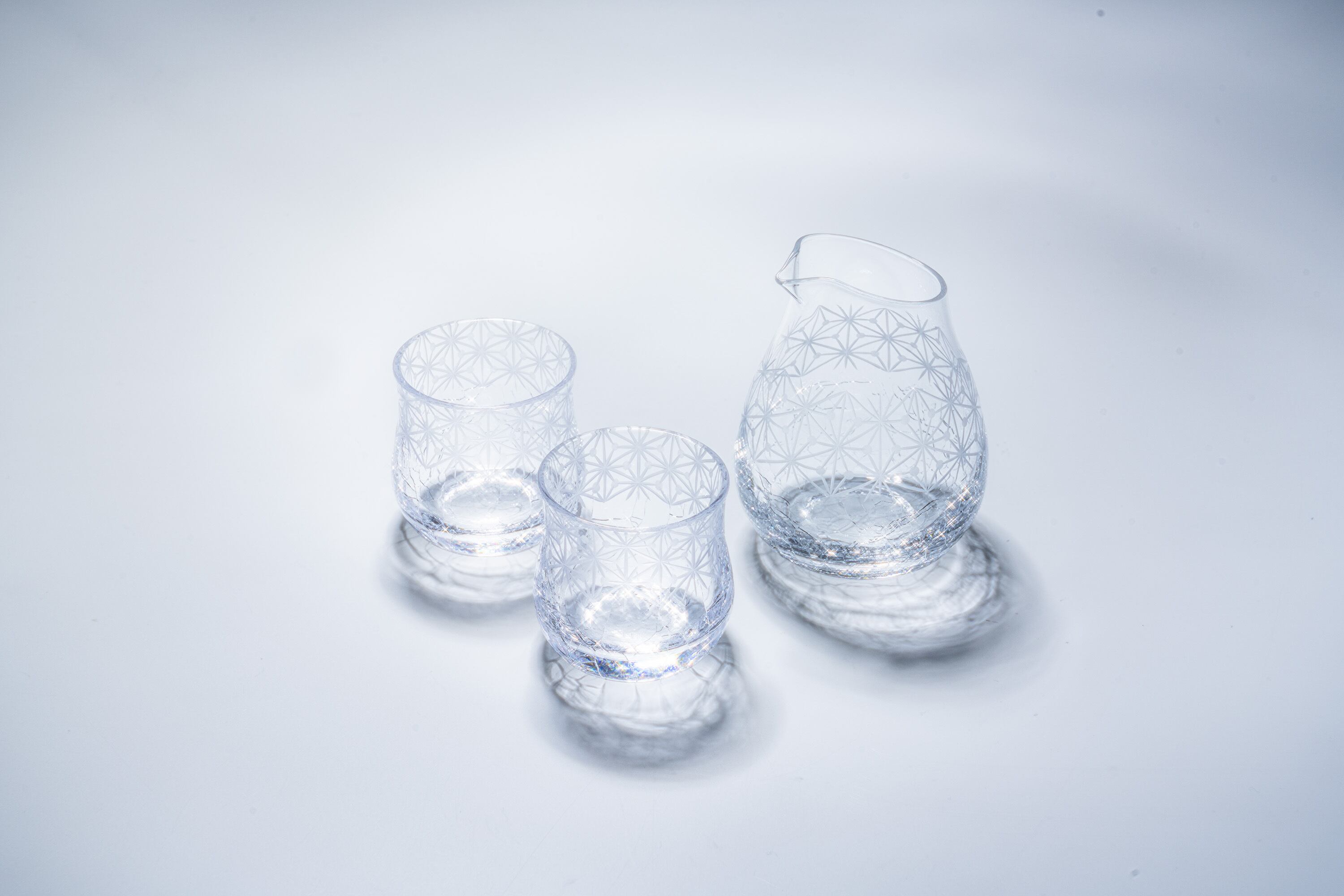 クラッシュ加工(ひび割れ加工)を施したキラキラ素敵なグラスと徳利に、伝統柄の麻乃葉を施しました。