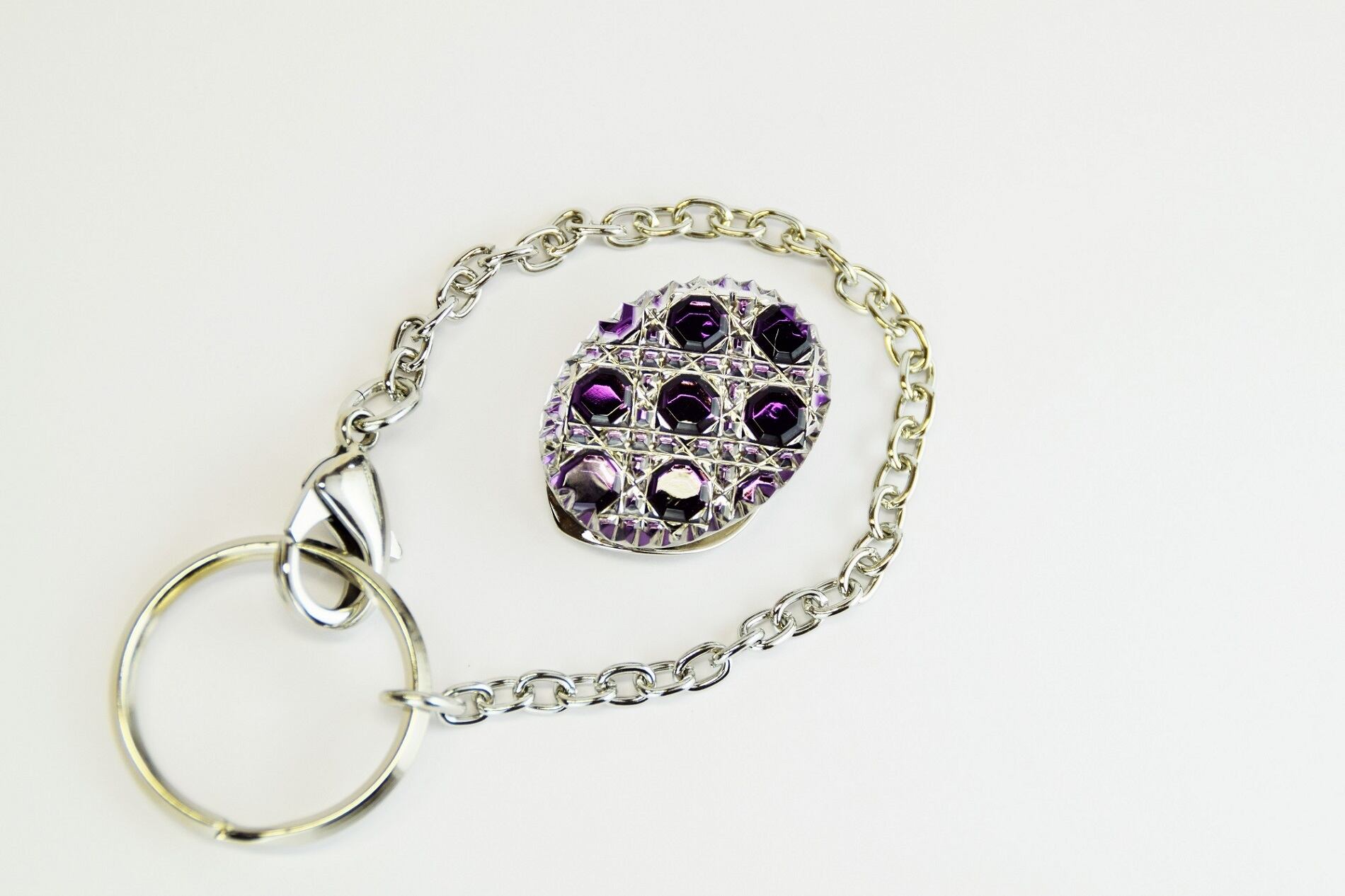 ガラスの裏に接着してある金物が光を反射させ、ガラスの中に光を取り込み、クリップの透明感を一層引き立てています。