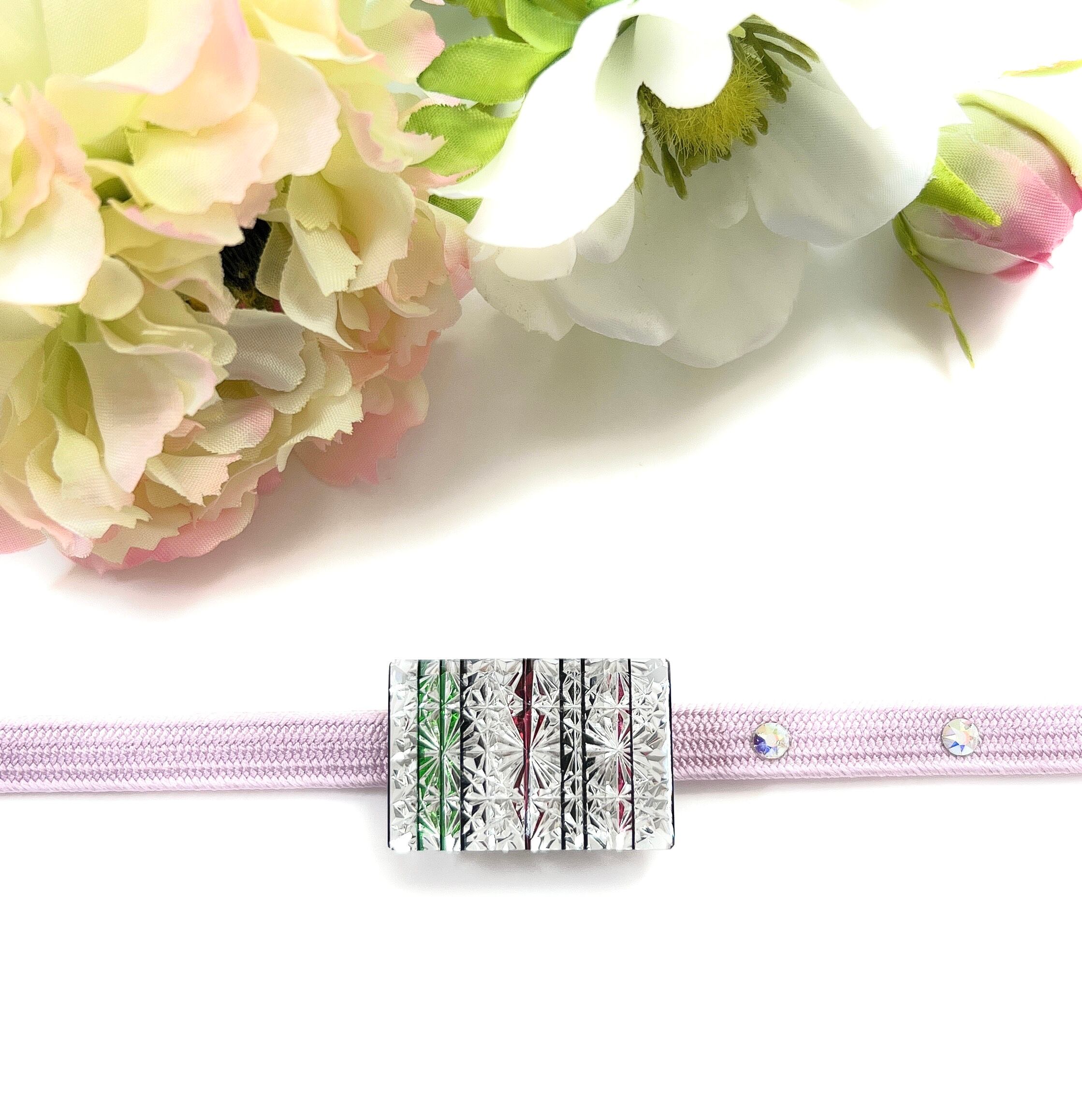 表面からは透明の縦縞の帯留めに見えますが、角度が違うと表情もガラッと変わってしまいます。