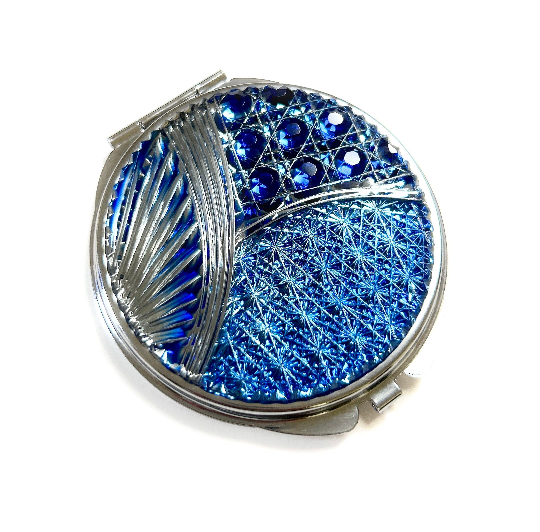 「縁起ミラー」東京切子コンパクトミラー 宝船 ~たからぶね~ 青 Silver