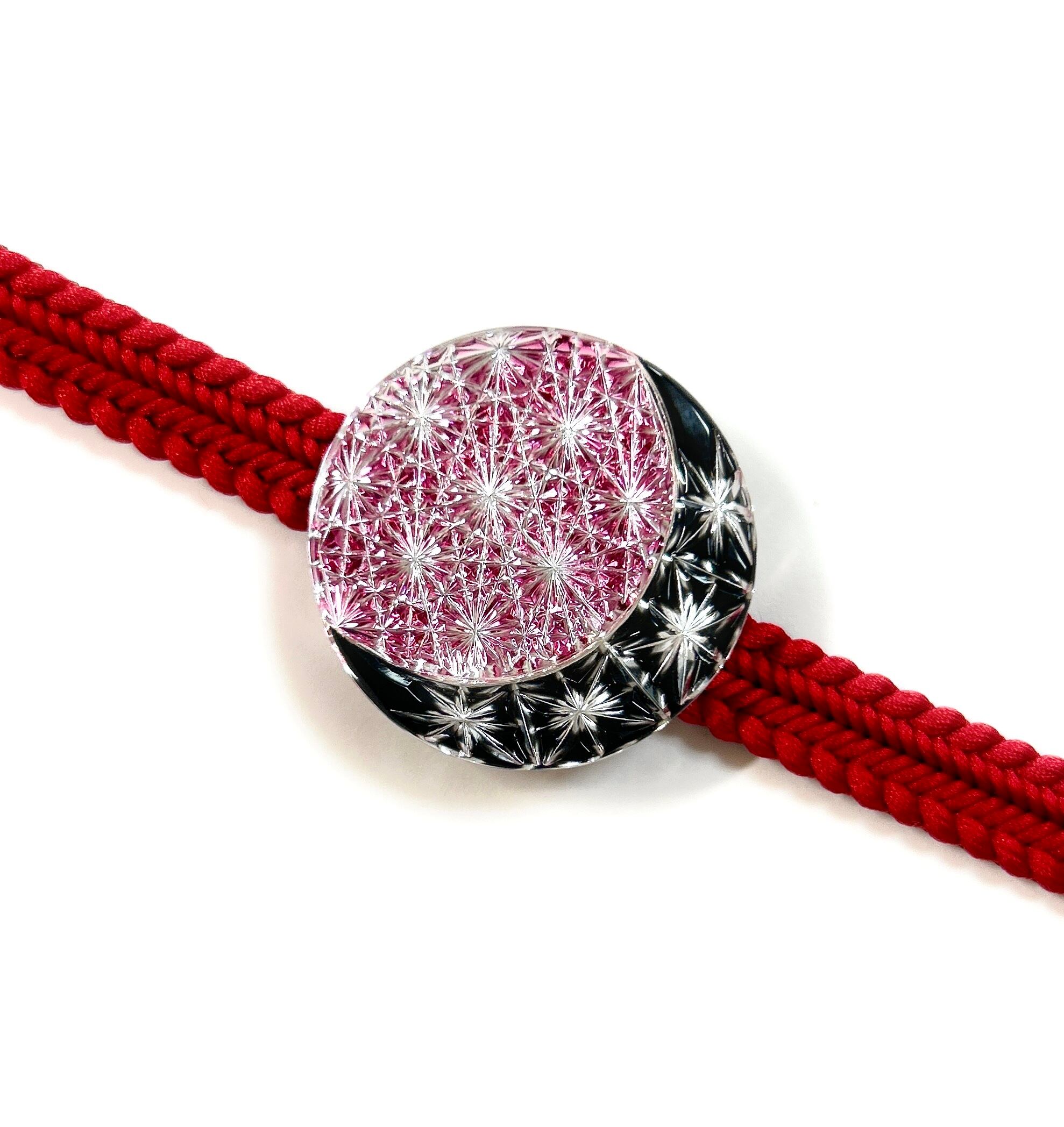 金赤のガラスに彫られた菊繋ぎは、長寿や幸福を意味し、皇室の象徴。