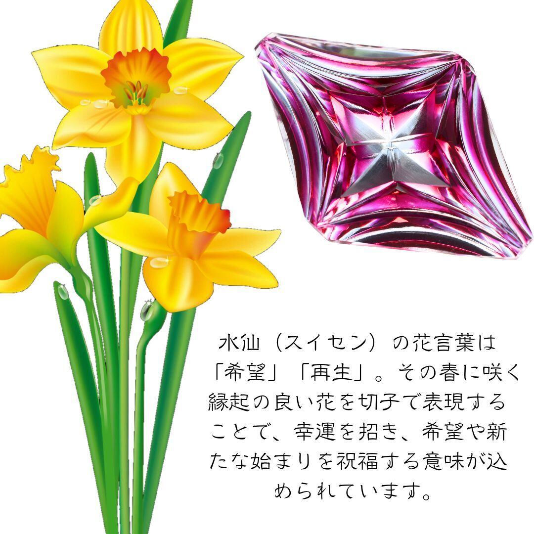 その春に咲く縁起の良い花を切子で表現することで、幸運を招き、希望や新たな始まりを祝福する意味が込められています。