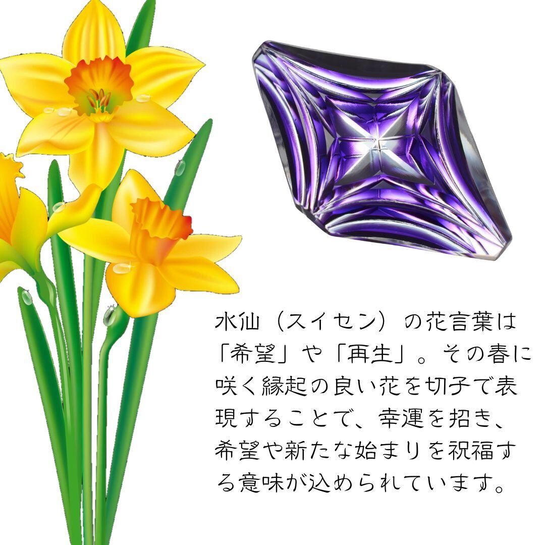 その春に咲く縁起の良い花を切子で表現することで、幸運を招き、希望や新たな始まりを祝福する意味が込められています。